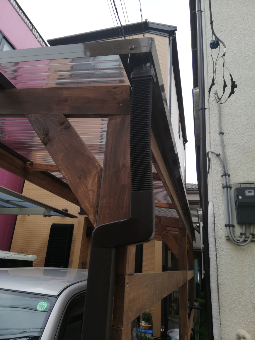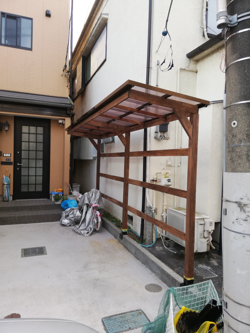 当初は土間に穴をあけて柱を立てるアルミのサイクルポートを検討しましたが、土間コンクリートの下に、下水管が通っており断念、結果オーライで。