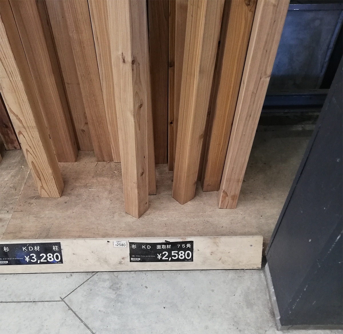 重い…… 75角で細い柱ですが、長さは4mあり、担ぐとズッシリときます。(^_^;) ウッドショックってやつですね(古い!)