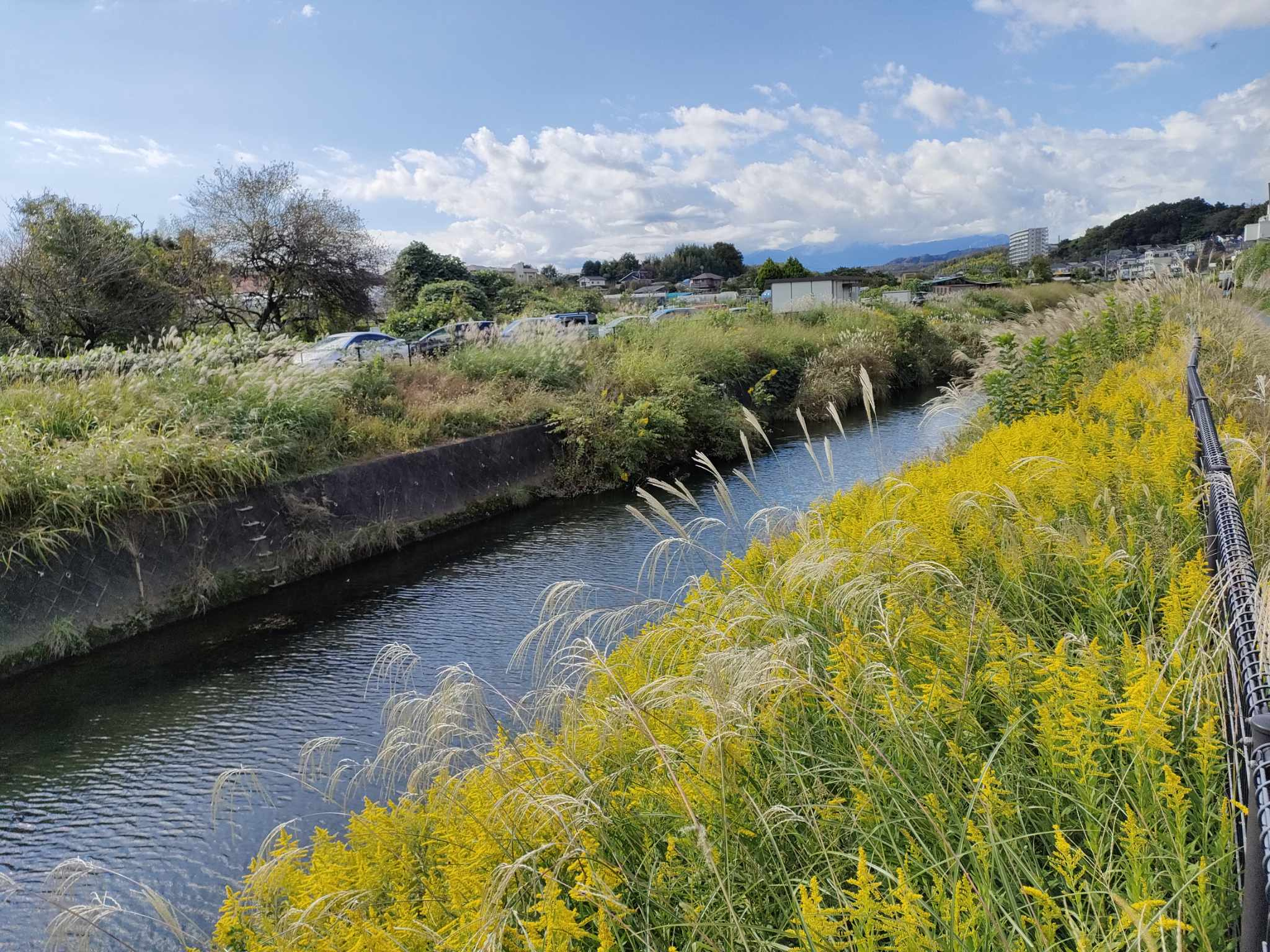 この時期、湯殿川は、セイタカアワダチソウの黄色が目に眩しいです。