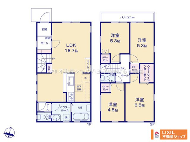 LDK 18.7帖 1室 洋室 6.5帖 1室 洋室 5.3帖 2室 洋室 4.5帖 1室 |