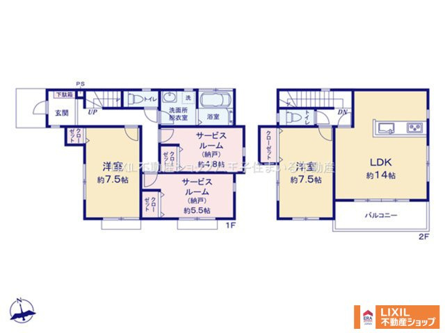 LDK 14.0帖 1室 / 洋室 7.5帖 1室 / 洋室 7.5帖 1室 / S(納戸) 5.5帖 1室 / S(納戸) 4.8帖 1室 / |
