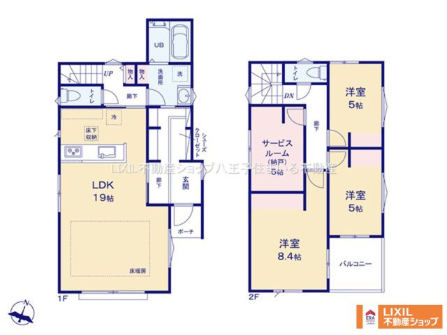 LDK 19.0帖 1室 洋室 8.4帖 1室 洋室 5.0帖 2室 S(納戸) 5.0帖 1室 |