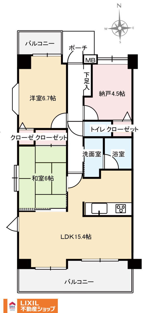 LDK 15.4帖 1室 / 洋室 6.7帖 1室 / 和室 6.0帖 1室 / S(納戸) 4.5帖 1室 / |